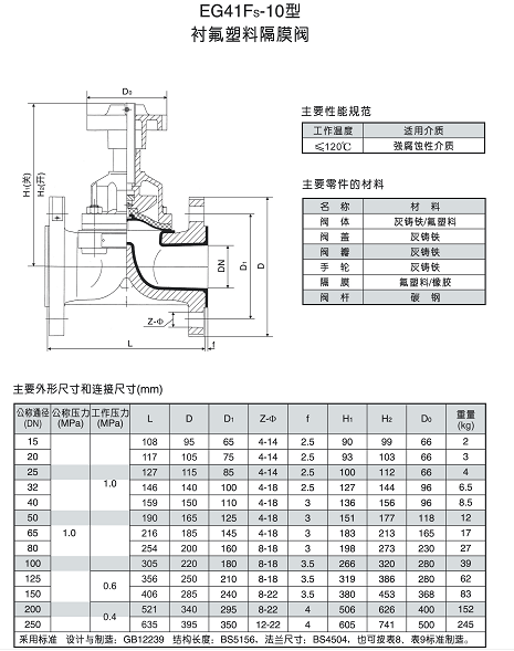 阀体材质: 灰铸铁/氟塑料
